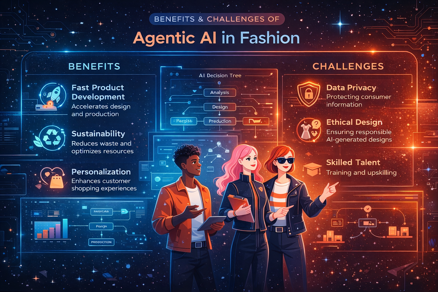 Despite its promise, agentic AI in fashion presents challenges. Data privacy and ethical concerns must be addressed, especially as AI systems require access to vast consumer data. Integrating AI with legacy systems can be complex, and brands need skilled talent to manage these technologies.