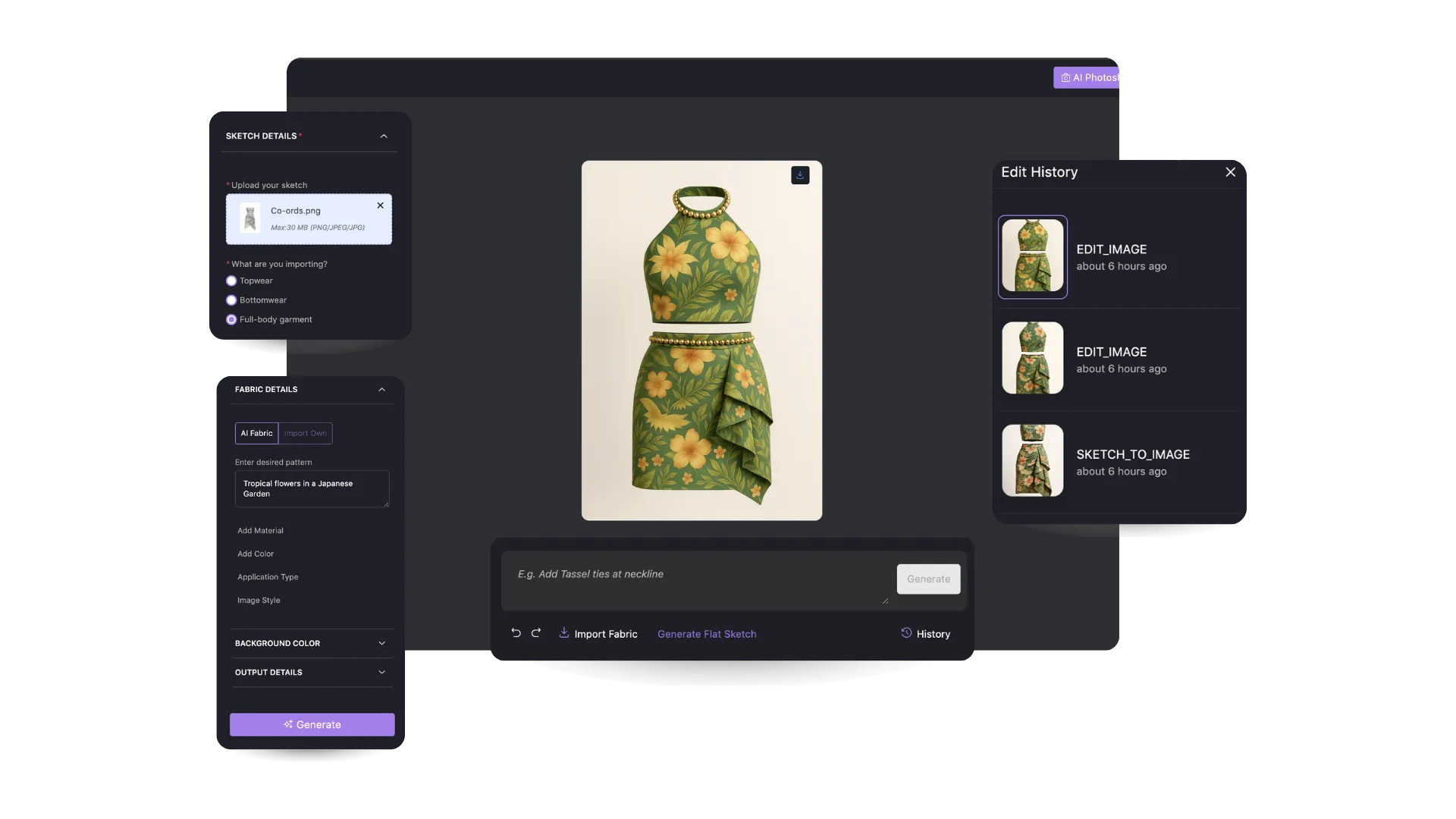 An AI fashion design canvas that turns inspiration into production-ready assets. Edit silhouettes, add trims, and generate clean flats for your AI tech pack.